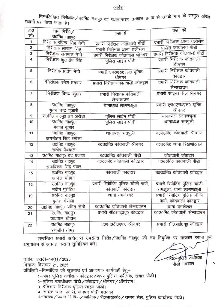 प्रमुख तबादलों में निरीक्षक रविन्द्र सिंह नेगी को कोतवाली पौड़ी से थाना थलीसैंण, निरीक्षक जयपाल नेगी को कोतवाली श्रीनगर से कोतवाली पौड़ी, निरीक्षक प्रदीप नेगी को एफएसएल यूनिट श्रीनगर से कोतवाली कोटद्वार, निरीक्षक रमेश तनवार को कोतवाली कोटद्वार से कोतवाली लैंसडौन तथा निरीक्षक विनय कुमार को कोतवाली लैंसडौन से साइबर सेल श्रीनगर का प्रभारी बनाया गया है।