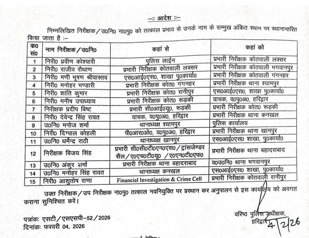 खबर डोज, हरिद्वार। हरिद्वार पुलिस महकमे में बड़ा प्रशासनिक फेरबदल किया गया है। वरिष्ठ पुलिस अधीक्षक हरिद्वार द्वारा जारी आदेश के तहत 15 निरीक्षक और उपनिरीक्षक (नापु) को तत्काल प्रभाव से उनके नाम के सम्मुख अंकित स्थानों पर स्थानांतरित किया गया है। यह फेरबदल पुलिसिंग को और अधिक प्रभावी बनाने, कानून व्यवस्था को मजबूत करने तथा प्रशासनिक संतुलन के उद्देश्य से किया गया है।