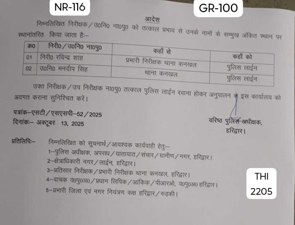 इंस्पेक्टर कनखल समेत तीन पर गिरी गाज, मनोहर रावत को मिला चार्ज, सतेंद्र भंडारी बने कनखल एसएसआई