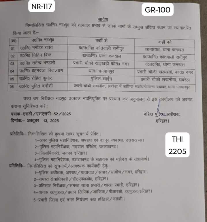 जबकि वरिष्ठ उप निरीक्षक नितिन चौहान को रानीपुर कोतवाली वरिष्ठ उपनिरीक्षक बनाकर भेजा गया है। खड़खड़ी चौकी प्रभारी सतेंद्र भंडारी को कनखल एसएसआई बनाया गया है।
