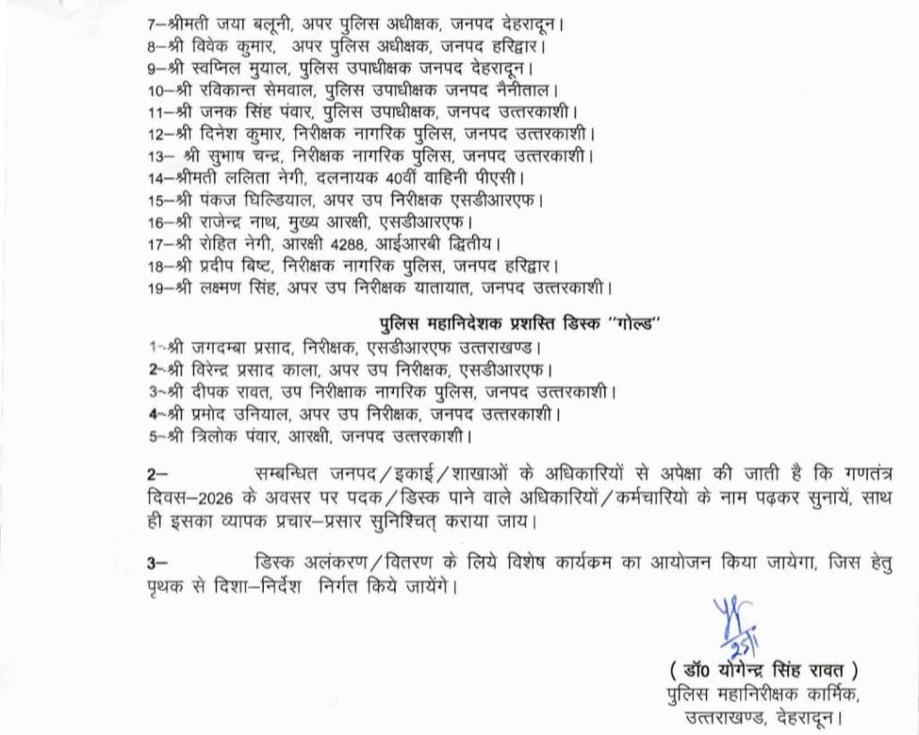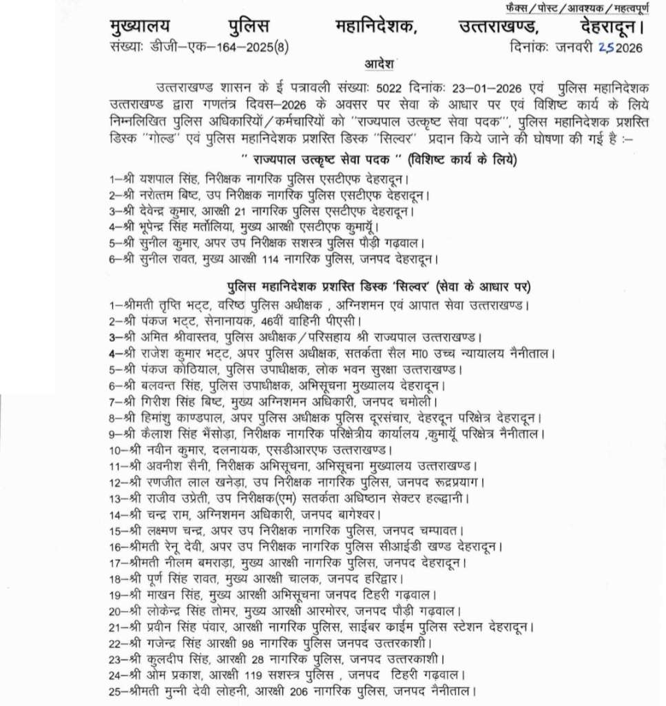 पुलिस महानिदेशक कार्यालय देहरादून की ओर से जारी आदेश के अनुसार राज्यभर के पुलिस अधिकारियों और कर्मचारियों को राज्यपाल उत्कृष्ट सेवा पदक, पुलिस महानिदेशक प्रशस्ति डिस्क ‘गोल्ड’ तथा पुलिस महानिदेशक प्रशस्ति डिस्क ‘सिल्वर’ प्रदान किए जाएंगे। यह सम्मान सेवा के आधार पर, विशिष्ट कार्यों के लिए तथा कानून व्यवस्था, अपराध नियंत्रण, साइबर अपराध, आपदा प्रबंधन एवं अन्य महत्वपूर्ण क्षेत्रों में सराहनीय योगदान देने वाले पुलिसकर्मियों को दिया जाएगा।
