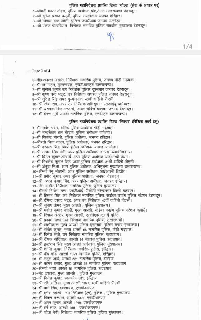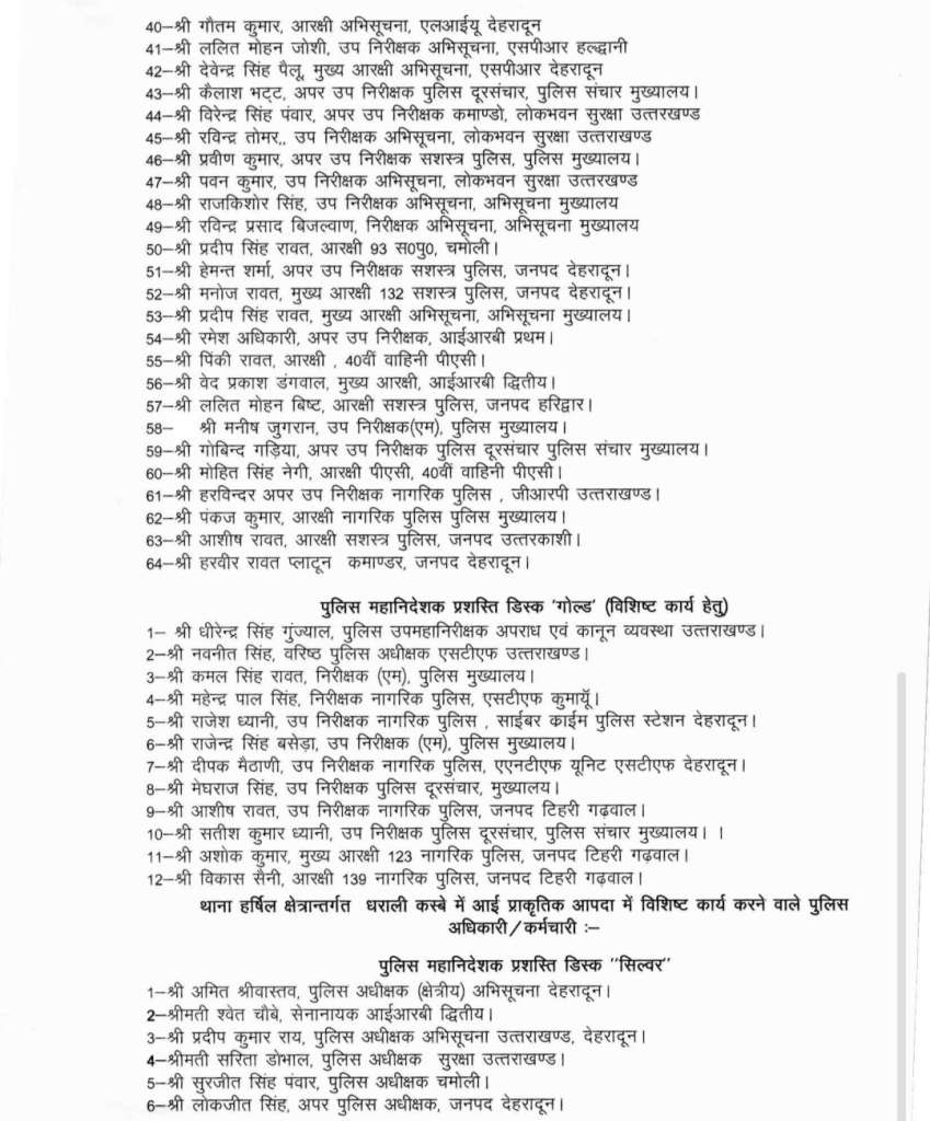 पुलिस महानिदेशक प्रशस्ति डिस्क ‘गोल्ड’ विशेष कार्यों के लिए प्रदान की जाएगी। इसमें पुलिस मुख्यालय, जनपदीय इकाइयों, साइबर क्राइम पुलिस स्टेशन, एसडीआरएफ, नागरिक पुलिस, सशस्त्र पुलिस एवं यातायात पुलिस से जुड़े कई अधिकारियों एवं कर्मचारियों के नाम शामिल हैं। वहीं पुलिस महानिदेशक प्रशस्ति डिस्क ‘सिल्वर’ सेवा के आधार पर एवं विशिष्ट कार्यों के लिए बड़ी संख्या में पुलिसकर्मियों को दी जाएगी।