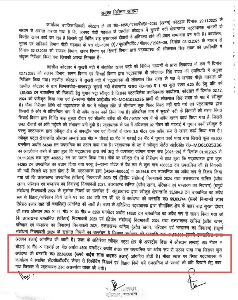 रिपोर्ट में यह भी उल्लेख है कि 1 अक्टूबर से 1 नवंबर 2025 तक विभिन्न तिथियों में अवैध रूप से 84,240 टन सामग्री अतिरिक्त खनन की गई। इसकी बाजार दर के अनुसार मूल्यांकन करने पर लगभग 35,58,584 रुपये की अवैध खनन सामग्री पाई गई। संयुक्त टीम के अनुसार पट्टाधारक द्वारा वास्तविक उत्खनन छिपाकर बड़ी मात्रा में राजस्व की चोरी की गई है।