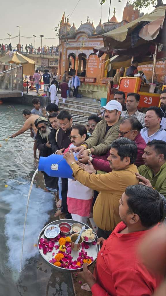 खबर डोज, हरिद्वार। प्रांतीय नगर उद्योग व्यापार मंडल की नवनियुक्त जिला कार्यकारिणी ने जिलाध्यक्ष डॉ. विशाल गर्ग के नेतृत्व में हरकी पैड़ी पर गंगा पूजन एवं दुग्धाभिषेक कर मां गंगा का आशीर्वाद लिया। इस अवसर पर श्री गंगा सभा के अध्यक्ष नितिन गौतम ने कार्यकारिणी सदस्यों का फूलमालाओं के साथ स्वागत किया।