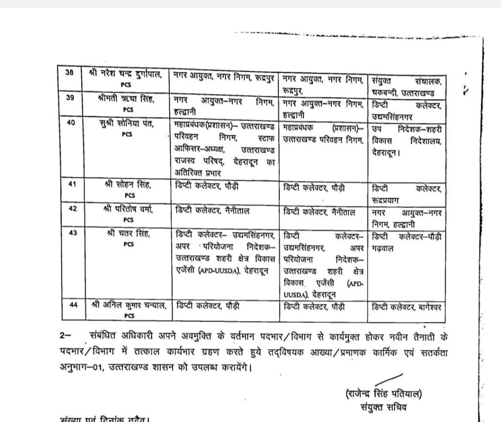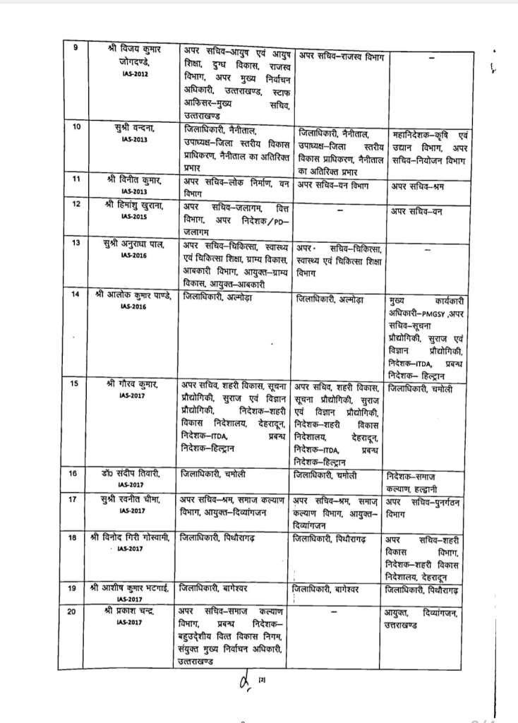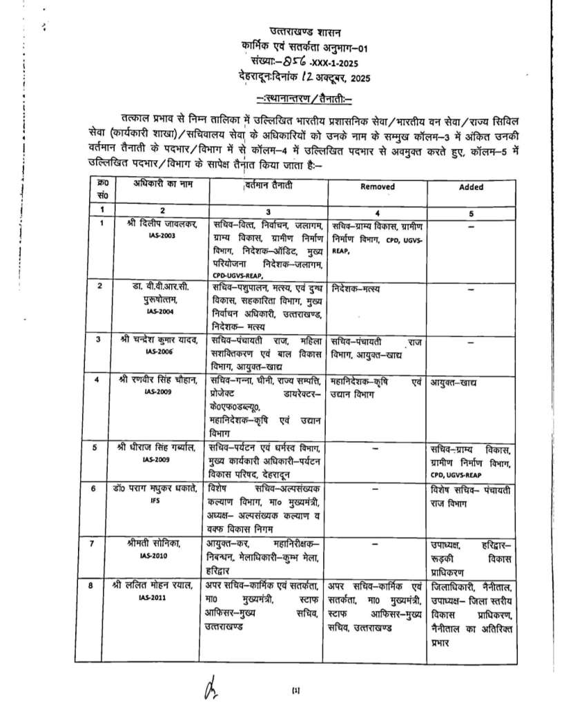 राजेश कुमार, सचिव वित्त, परिवहन, जलागम, ग्राम विकास, ग्रामीण निर्माण विभाग को सचिव–प्राथमिक शिक्षा, ग्रामीण विकास विभाग का अतिरिक्त प्रभार दिया गया। डॉ. नीरज खैरवाल, सचिव-ग्राम्य विकास, सहकारिता विभाग, को सचिव–नगरीय विकास एवं निर्माण अधिकारी, उत्तराखंड के पद से मुक्त किया गया। हरीश कुमार यादव, सचिव–पंचायतीराज एवं महिला सशक्तिकरण विभाग को राज्य खाद्य आपूर्ति विभाग की जिम्मेदारी सौंपी गई। रंजीत सिंह चौहान, सचिव–गन्ना एवं राज्य संपत्ति विभाग, को आयुर्वेद एवं खाद्य आपूर्ति विभाग का प्रभार दिया गया। धीरज सिंह गबर्याल, सचिव–पर्यटन एवं तीर्थाटन विभाग को ग्रामीण विकास, ग्रामीण निर्माण विभाग, CPO, UGVS-REAP का प्रभार दिया गया। डॉ. पराग मधुकर धकाते (IFS) को सचिव–पंचायतीराज विभाग की नई जिम्मेदारी दी गई है। ललित मोहन राय, अपर सचिव–मुख्यमंत्री एवं मुख्य सचिव कार्यालय को मुख्य प्रशासन अधिकारी, मुख्यमंत्री कार्यालय के पद से मुक्त कर नैनीताल जिले का प्रभारी अधिकारी नियुक्त किया गया।